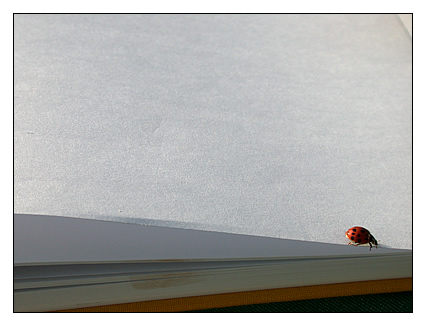 Die Spuren, die der Tag hinterlassen hatte, als ein feines Getrippel durch ein Buch mit leeren Seiten, die ich beschrieb ohne ein Wort zu notieren, weil ein kleiner Käfer die Punkte entführte, nach denen ich mich ausrichtete und einfach davon flog und sie mitnahm, erst dann sah ich, dass der Abend und die Seite voll waren mit Geräuschen, denen ich nun folge.