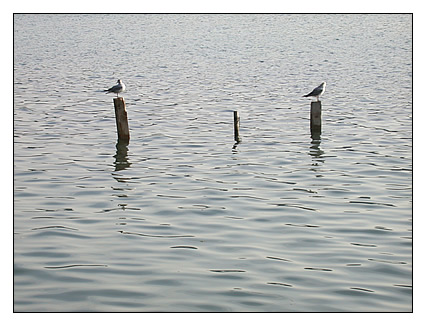 Eine Fläche die See heisst, die Ufer spiegelt und Möwen, die auf kleinen, aus dem Wasser ragenden Stäben sitzen, auffliegen und landen, ist eine kleine Ansammlung von Wassertropfen. Das Wort Meer ist grösser. Ozean, so überlege ich mir, während ich am Ufer sitze, kommt mir schwerer vor, wegen des Salzgehaltes. Das Wort Welle, ist für sich gedacht, nicht besonders gross oder klein, es ist einfach einwenig blaue Farbe.
