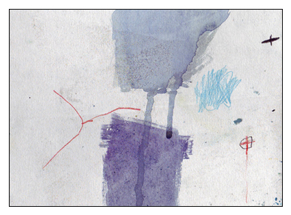 P4 Das Zeichen für „Verbindung zweier Planeten“ fand ich zufällig. Während ich versuchte ein Gespräch zwischen zwei Menschen aufzuzeichnen, die weit voneinander entfernt wohnten, malte ich die Einfahrt eines Schiffes in den Hafen einer Stadt am Meer, eine Möwe und eine Navigationsboje. Abgelenkt durch die Überlegung, was eben in dieser Minute alles gleichzeitig geschehen würde, würde ich das kleine Blatt in die Höhe halten und die Farben ineinanderlaufen lassen, wechselte ich den blauen Stift mit einem roten Stift und zog zwei feine Linien; sie folgten dem Weg der Gedanken während des Denkens vom einen zum andern in Gedanken nach.