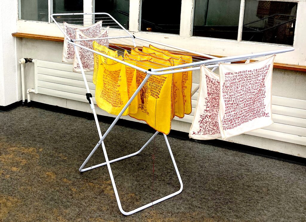 Über die Poesie des Staubes, Staubtücher mit vor zu „aufgewischten“ Worten: Hinter und vor dem Horizont liegt Staub und die Arbeit mit dem Staubwischen und mit den Worten geht weiter und weiter. Beides Sammelt sich und formt sich und löst ich wieder auf.